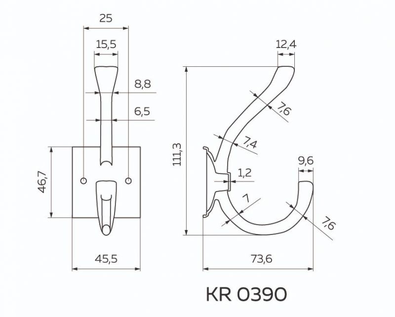 Чертёж - Крючок 2х-рожковый мебельный античная бронза KR-0390-AB.