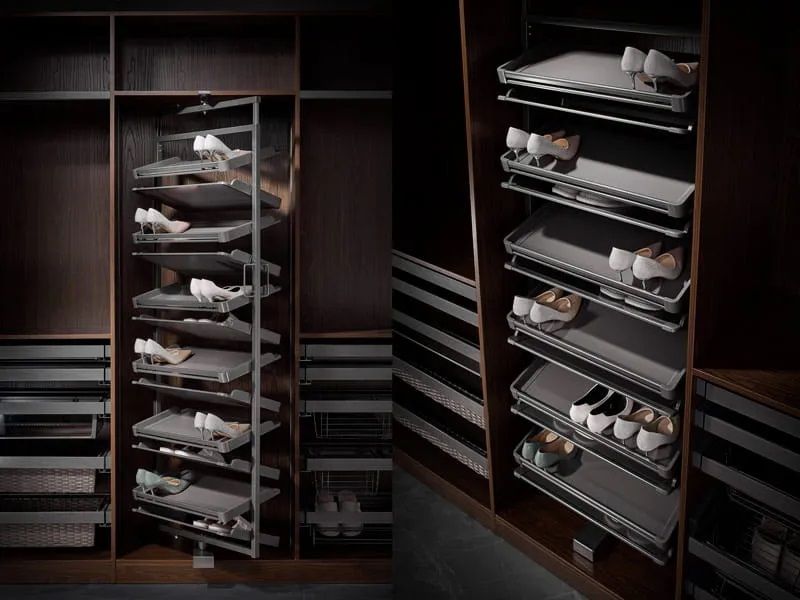 6. Полки 2х-сторонние полки, вращающиеся на 180 градусов - для сторонников большого количества обуви. Полки изготовлены из пластика со вставками из искусственной кожи.