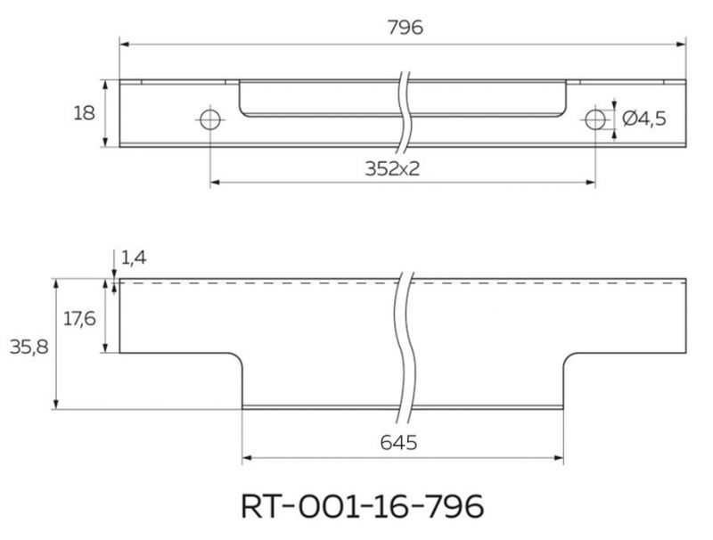 • Установочный размер между винтами 796 мм. Габаритный размер: 796х35.8х18 мм.